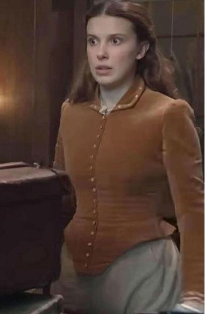 Millie Bobby Brown Enola Holmes Brown Jacket is a handmade garment made from high-quality velvet fabric. It has inside is lined with soft viscose fabric for a comfortable fit. It features a buttoned front, long sleeves, a folded collar, and rounded cuffs. It also includes two external hip pockets and one internal pocket. And the colour is brown. You can wear this loving outfit at parties and birthday events. Order this fabulous attire and enjoys free shipping from celeb-style outfits.