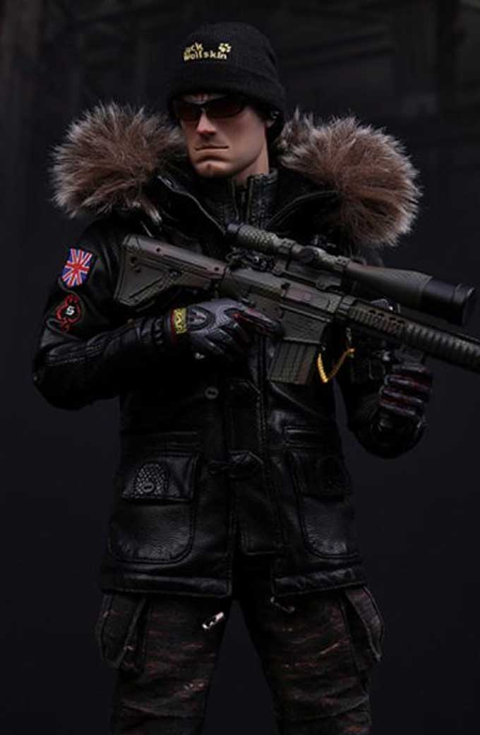 "Baron" appears on a 1/6 scale from Dam Toys' "Gangsters Kingdom" series. Barron is a stylized character modeled after the actor "Jude Law". Baron is a fictional character and a sniper in Gangster Kingdom Spade 5. He must hunt down a terrorist target, but reality shocks him and his sniper. He wore this Gangsters Kingdom Spade Baron Leather Jacket on this mission.