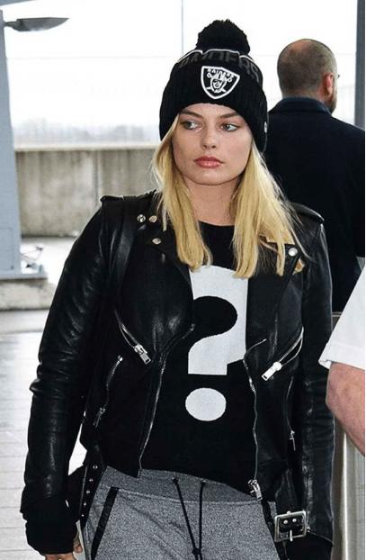 Margot Robbie Heathrow Airport Casual Womens Biker Black Leather Jacket