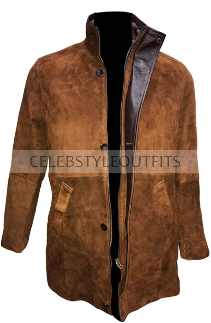 Longmire Robert Taylor Brown Coat is made up of suede leather. It has an inner viscose lining that keeps it warm and cozy, the collar is shearling with a snap tab button, and its front buttoned closure and cuffs are open hem. There are two pockets outside and two inside. It is available in brown color, and it is available in our stores.