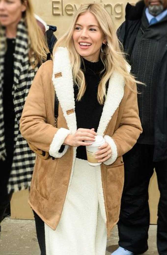 Sienna Miller is a well-known British actress and fashion icon who has graced screens and red carpets with her talent and style. Her fashion sense has made her a trendsetter, and her unique style has inspired many fans worldwide. In one of her recent appearances, Sienna was seen wearing a stylish brown shearling and suede coat that has become a fan favourite. Introducing the Sienna Miller Casual Brown Coat, a stylish and cosy piece of outerwear that is perfect for fashion-conscious women. its brown colour gives it a warm and versatile look that can be easily paired with any outfit.