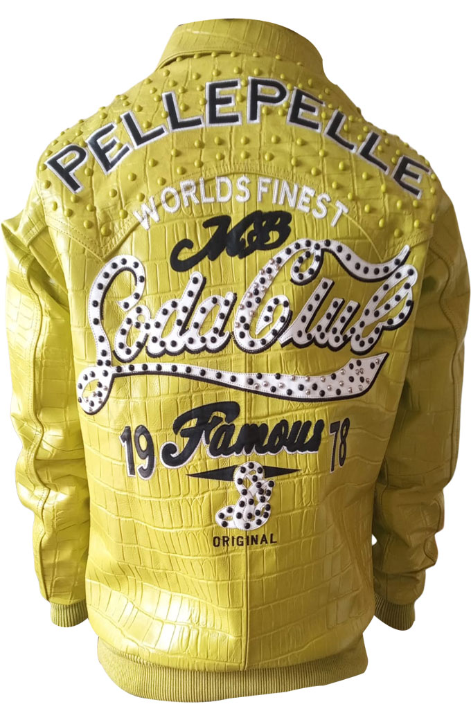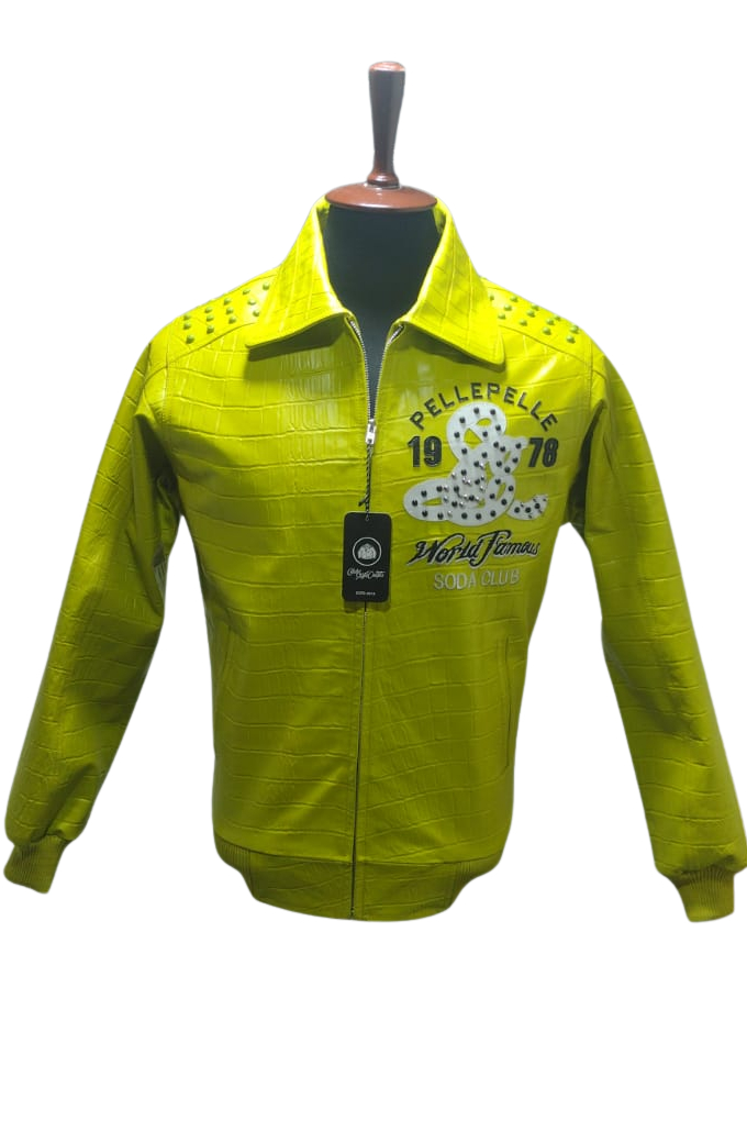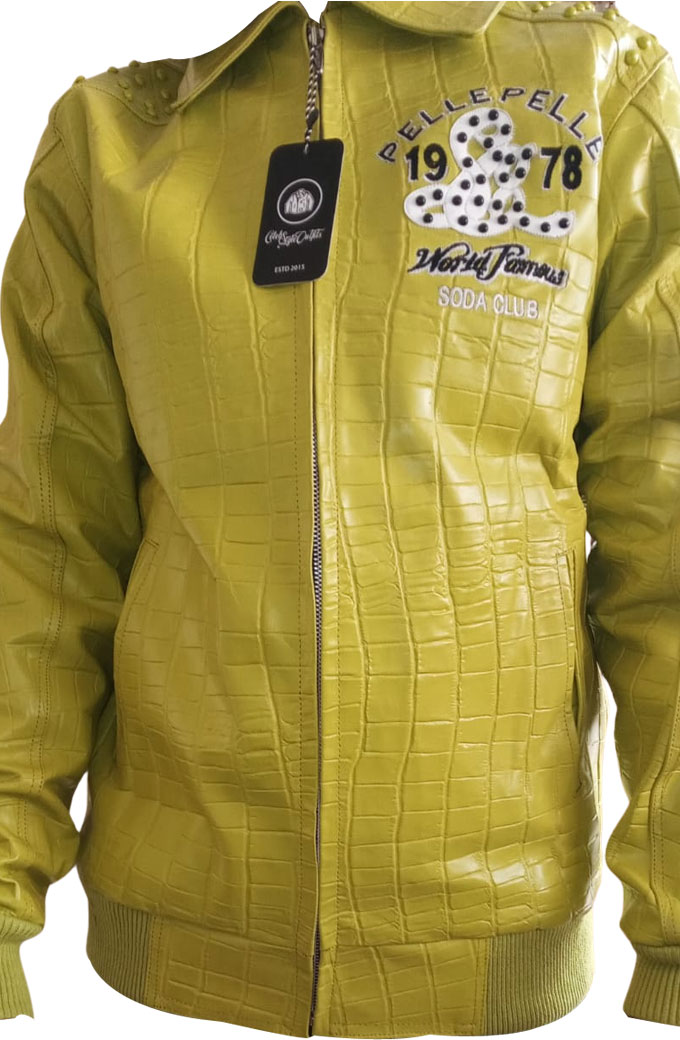 Soda Club Pelle Pelle 1978 Yellow Leather Bomber Jacket is now available in our Store. The most recommended embroidered studded apparel with genuine and top quality leather and a warm inner layer having pockets on the front to keep you warm all winter. With rib-knit details and a soft viscose lining, this jacket is perfect for cold weather. Youβll love the buttoned closure and elastic waistband on this stylish jacket.